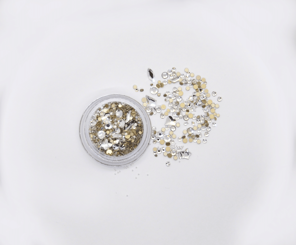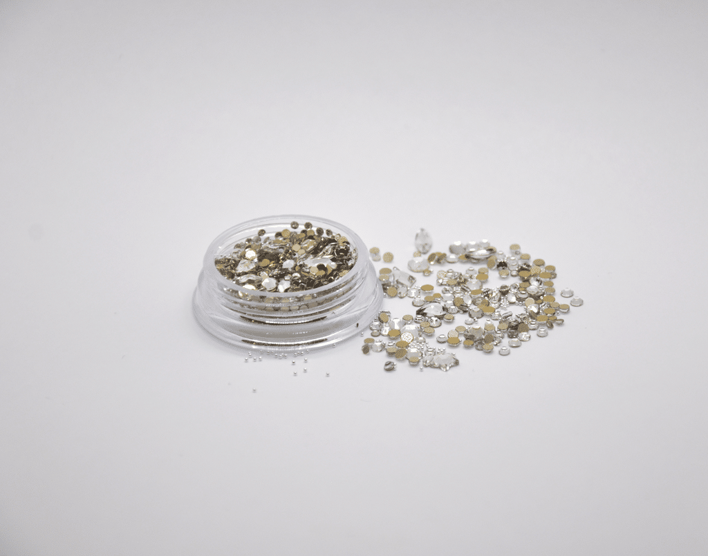 Lajitelma eri kokoisia ja mallisia kynsitimantteja.
